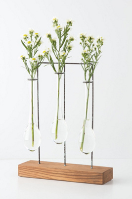 The center vase is mounted a little higher than the flanking ones so it looks nicely arched if your stems are all the same height. It would look great on a shelf or against a wall.